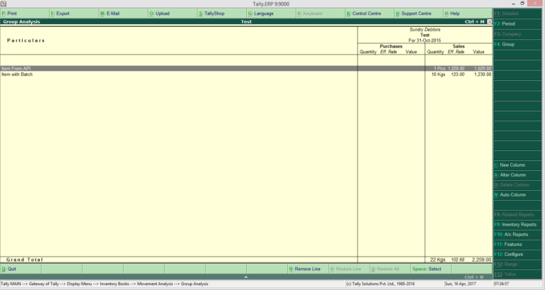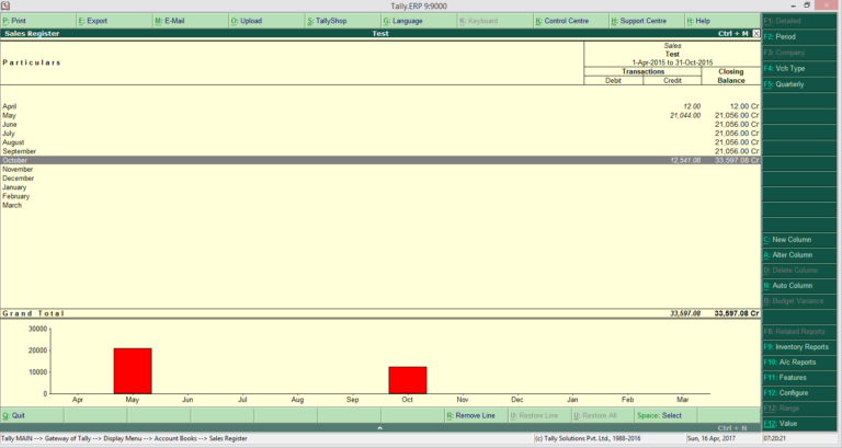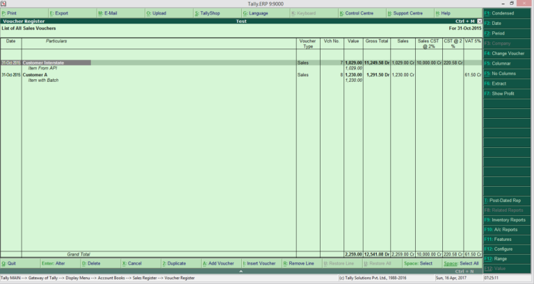 This shows the list of sales vouchers for the day which can be used as a customer wise daily sales report. In case you want additional information such as item details or invoice details then you can click the F12 -> Configure option and select “Show Columnar Register” as “Yes” and put the option in the configuration screen to generate the report with additional details.