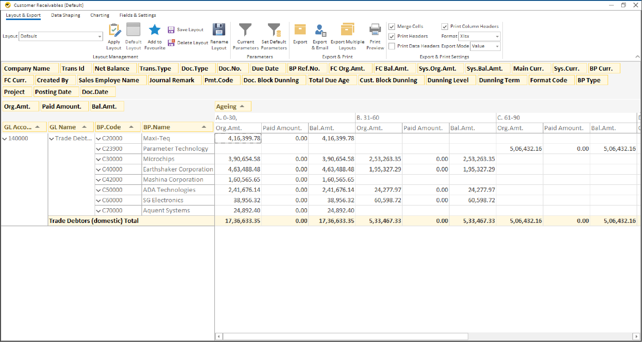You can see ageing customer-wise (BP Name), making it easy to follow up with specific clients whose payments are overdue. You can also drag and drop fields in the report layout and save different layouts which help you automate different reporting formats.