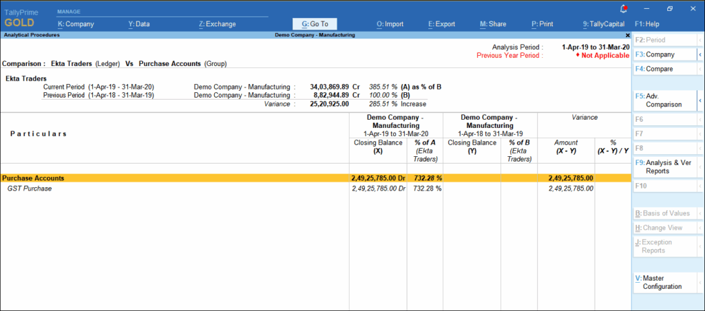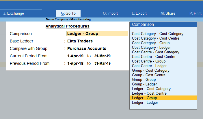 Access: Go to Gateway of Tally > Display More Reports > Analysis & Verification > Data Analysis > Analytical Procedures. Filter the required fields for comparison and proceed.