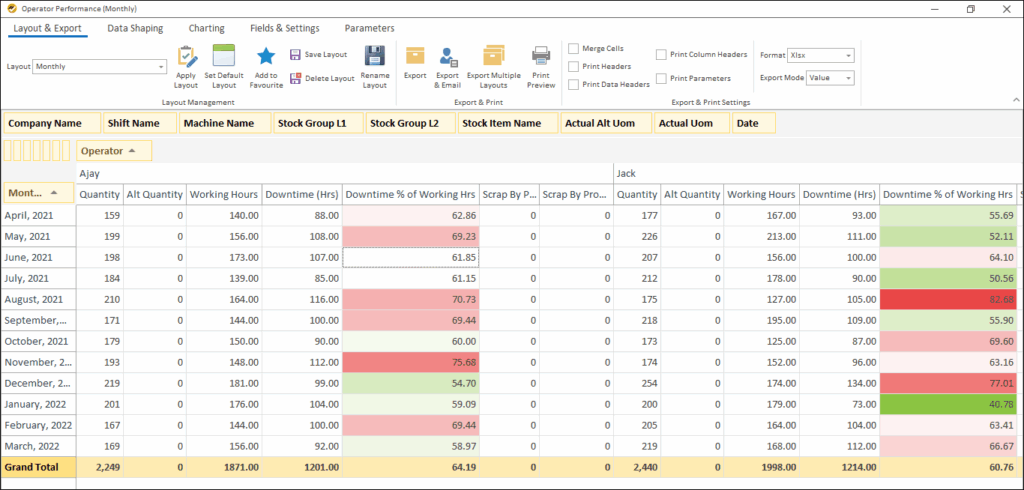 - Track monthly operator performance in terms of production, productive hours, and rejections
