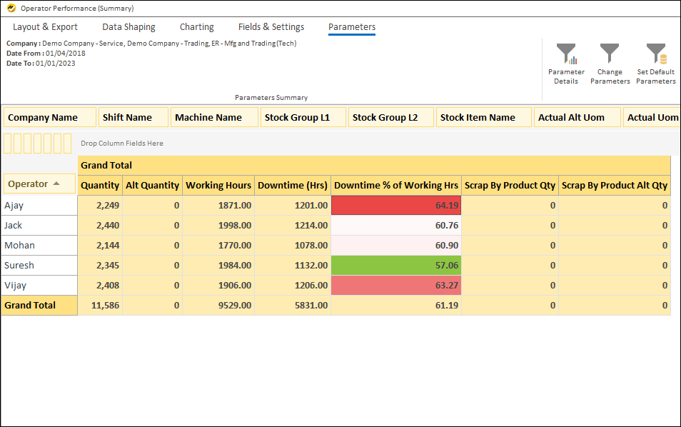 - Track operator performance for a selected period in terms of production, productive hours, and rejections