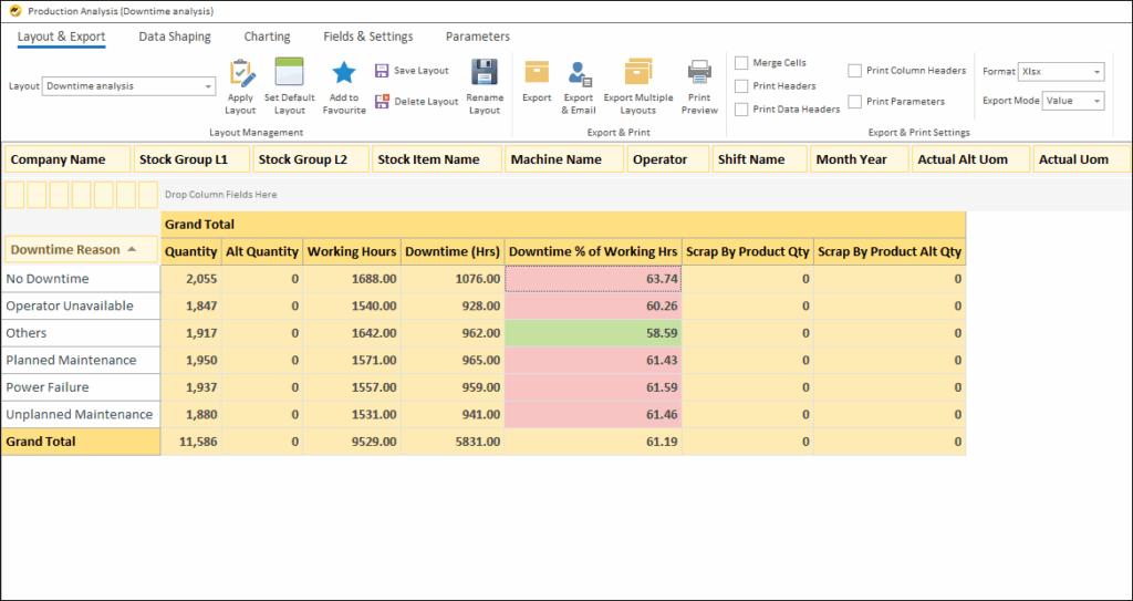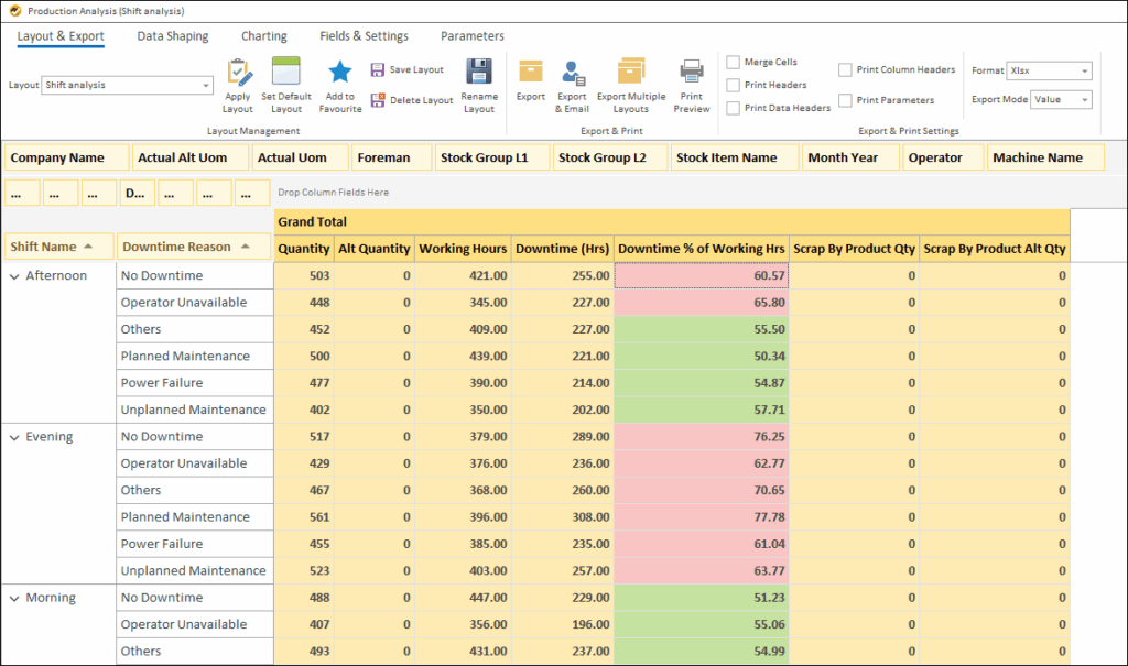 - Get month-wise, quarter-wise, or date-wise breakup of shifts to identify repeated reasons for downtime