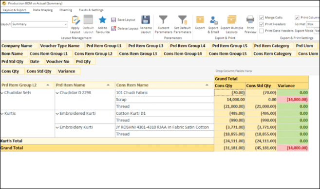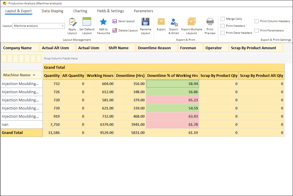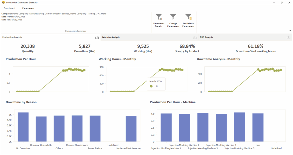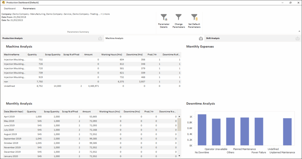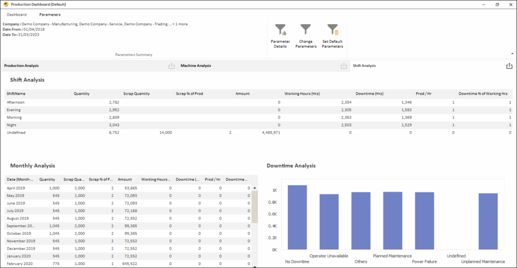 - Get production analysis by different dimensions like Item, Machine, Operator, Shift, Month, etc.