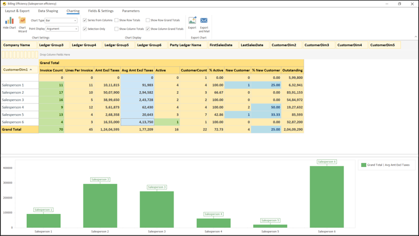- Track billing efficiency using metrics: total invoices, average ticket size, new customers, outstanding, last sales